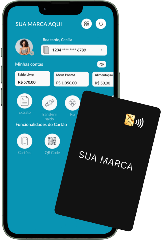 Seu cartão se torna um ponto de contato direto com o público, refletindo a identidade visual da sua marca com cores, logotipo e elementos personalizados que fortalecem o reconhecimento e a experiência do usuário.